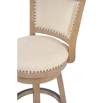 Make a statement with the Melrose Barstool. Accentuated with the attractive multistep wire-brush finish, soft linen upholstery and genuine brass nail heads. Both sides of the backrest are upholstered and lined with antiqued finish nail heads. Available in a driftwood gray wood finish with a choice of oatmeal and ivory linen upholstery. Both options are designed with precision engineering, made with solid rubber wood and guaranteed to last. The Melrose also features a full-ring footrest protected with a metal kick plate on top, double seat apron, high density foam cushion and a ball bearing steel swivel plate which provides a flawless three hundred and sixty degree swivel. Available in 24 inch, counter height as well. Due to differences in monitors as well as variances in the finishing process, colors of products may appear different from those shown on the site.