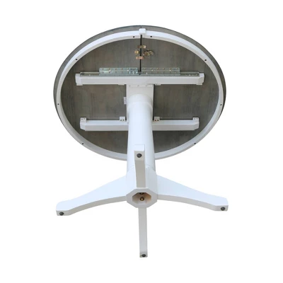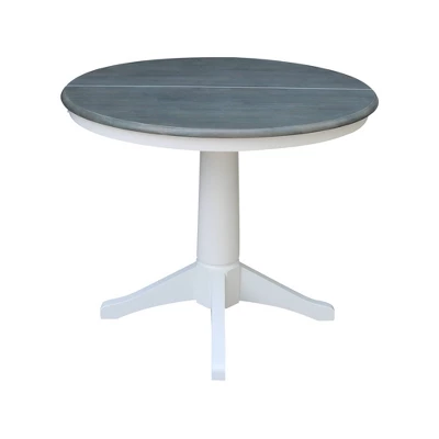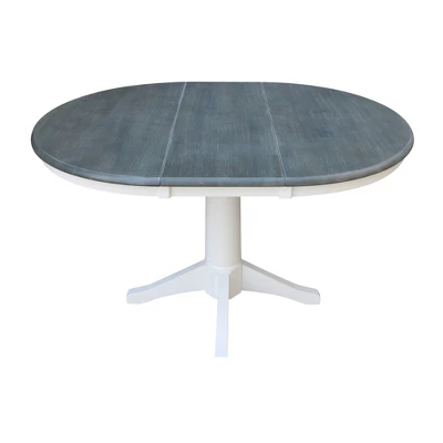 International Concepts home furniture is for those who appreciate high quality, wood furniture with a traditional and elegant look. This piece will beautifully complement your kitchen or dining room. This dining table is made of solid wood ensuring years of use. The table measures 36″W x 36″D x 30.1″H. With 12″ extension leaf, table expands to 36″ x 48″. It has a pedestal base with four feet for maximum support. The dining table has a dual-toned white and heather gray finish, and ships ready to assemble.