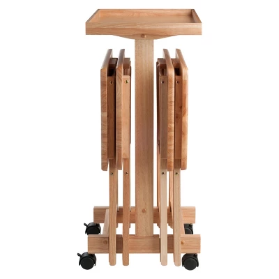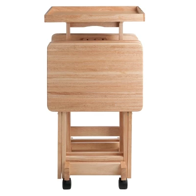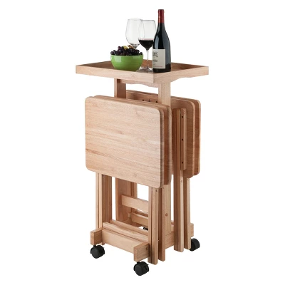 Now the whole family can relax in front of the TV with the Six-Piece Snack Table Set from Winsome. This set of foldable snack tables comes in a natural wood finish for a look that blends well with your existing decor, and the four included tables feature stable wooden construction that provides a convenient movable surface that’s perfect for snacks or drinks. The tables fold up for easy storage when not in use, and the wheeled storage frame has a tray-table top that provides a space for carting dishes and goodies in and out of your space.
