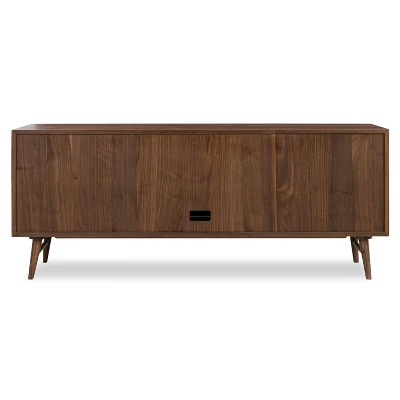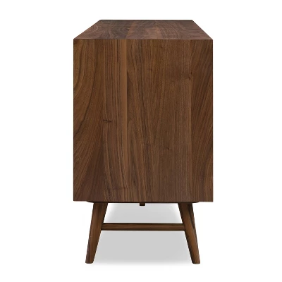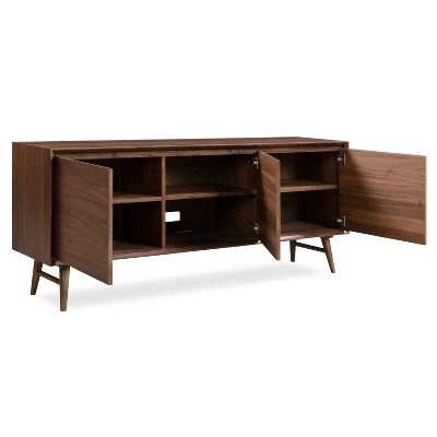 The Lena Sideboard borrows its turned legs, clean lines, and richly-grained walnut veneer from iconic 1950s and ‘60s designs. Adding warmth and simplicity to a dining or living area, it features a walnut veneer frame set on solid walnut legs. Three doors open to reveal generous shelves, including cable cutouts, letting the Lena seamlessly swing from sideboard to media stand (or perform double duty).