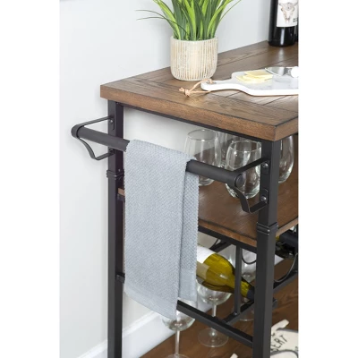 Set the stage for endless cocktail gatherings with the addition of this clever wine cart. Equal parts rustic and industrial, its open design adds a fresh touch to decor while wood planked detailing complements traditional and modern settings. Use the under rack to hang your favorite stemware and grab any wine choice from the spacious dual-level rack. The bottom storage shelf is perfectly sized to keep additional serve ware nearby as you wheel this bar cart throughout the night between rooms. Can accommodate compact microwave ovens.