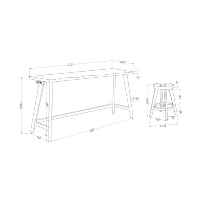 - Table: 36.25 in. H x 72 in. W x 20.13 in. D; Stool: 24.25 in. H x 21.75 in. W x 21.75 in. D