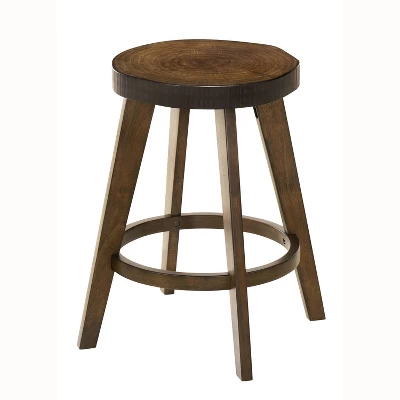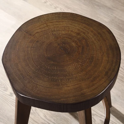 Rustic and inviting, this four-piece counter height dining table set includes electrical and USB ports for easy charging of smart devices or working from your laptop. The table feature a counter height design with a live edge style front to complement its long, narrow silhouette. Three backless barstools feature a tree slice style cross section seat atop angled legs. A deep walnut finish complements real pine veneer and rubberwood construction.