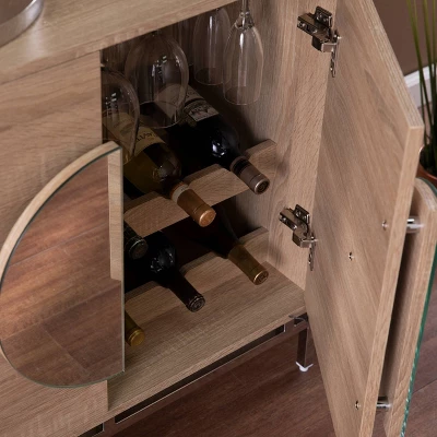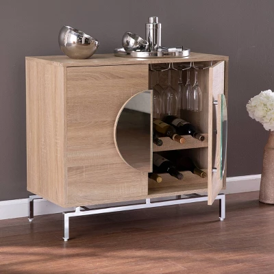 Give your wine storage a chic upgrade with the Aiden Lane Befail Bar Cabinet with Wine Storage. Bottle holders and wine glass racks keep drink essentials within reach, while two cabinet shelves tuck away mixers and spare towels. Mirrored handles give your décor a contemporary edge, adding a sophisticated twist to your dining room or open concept space. Turn your small space into a modern bar when you bring home this bar cabinet with storage.