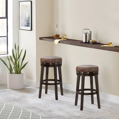 - Smoke Brown, backless wood bar stool, featuring a round, 360° swivel seat with Deep Brown faux leather upholstery and oversized nail head trim