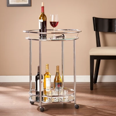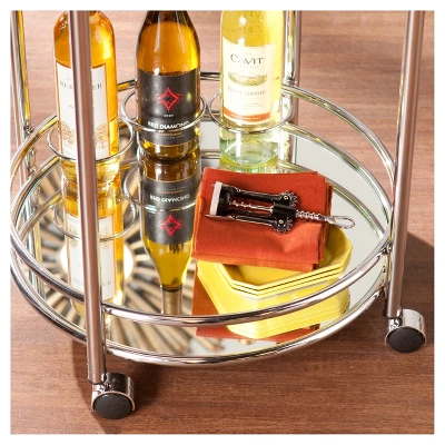Host in style when you bring home the Aiden Lane Camden Glam Rolling Bar Cart with Mirrored Shelf Metallic Chrome. A sleek, rolling design easily takes drinks and appetizers from room to room, while mirrored shelves and high-shine guardrails keep essentials organized and within reach. Tuck this small space serving table into your dining room to mix up cocktails with dinner, or wheel throughout your open concept space to deliver party treats all evening long. Add a touch of glam to your entertaining space with this round bar cart.