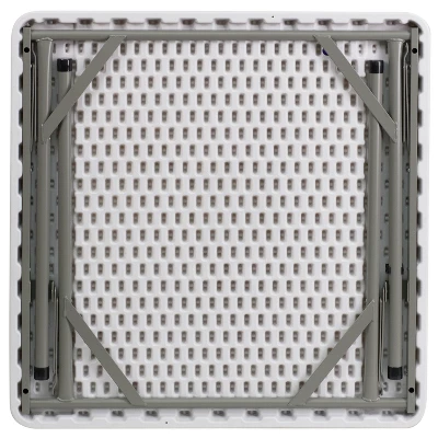 It’s game time when you pull this folding table out that folds in half and includes a carrying handle to take with you anywhere. This square plastic folding table is perfect size seating up to 4 people for charades, card and board games, making slime, or painting clay pots. This compact table can serve multiple uses in the hospitality industry, business offices and in the home to seat extra people or hold plates, napkins and cups during gatherings. Dine outdoors on the deck to enjoy the summer breeze, this table sets up in no time. This mini table travels well for people who live on the road in vans, campers and RVs. When you’re ready to put away the legs lock underneath the top to be stored away. Enjoy this portable table inside or outside but always store indoors to protect the frame from extreme moisture. Additional Features: Gray Powder Coated Locking Legs with protective floor caps, Legs fold underneath top for flat storage