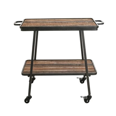 Expand your home storage options stylishly with this nifty bar cart. This rolling storage cart is a smart choice for kitchens and dining rooms with limited counters or cabinets, since it provides two amply sized shelves to hold small appliances, serving pieces, cookbooks or snacks. It’s an ideal piece for bottles, glasses and mixers too. The two-tiered cart rolls easily from room to room when you’re hosting guests – simply lock the wheels when you’re ready to serve. The bar cart isn’t only about function. Its good looks start with the industrial metal frame with rectangular side handles. The solid wood shelves have an interlocking plank-style look that complements both hardwood floors and area rugs beautifully. The bar cart proves that rustic style fits in well with contemporary and traditional decor alike.