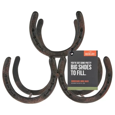Giddyup, partner, and store your booze cowboy style. This horseshoe-shaped wine rack pays homage to the wild west while storing wine bottles, liquor, or beer with rustic country flair. Holds 3 standard bottles Cast iron with antique metal finish Rustic horseshoe design 10 x 5.5 x 8.5 inchesFoster & Rye combines rugged utility with quality materials and classic vintage stylings for barware accessories that stand the test of time. Discover metal camping mugs, novelty bottle openers, and leather flasks that are perfectly at home on your bar cart or in the great outdoors.