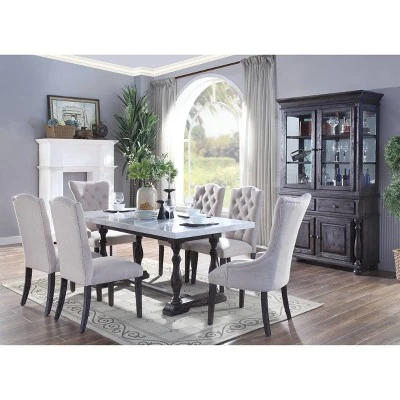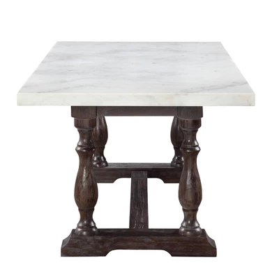 The Gerardo dining table from ACME Furniture delivers an elegant approach on rustic inspired design. It features a beautifully designed trestle base with a sturdy white marble top for a deliciously modern serving of mixed media style. Your ideal table for all your meals, from top to bottom in just the right size.