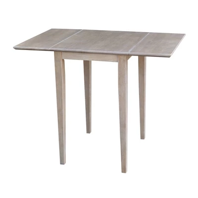 International Concepts home furniture is for those who appreciate high quality, wood furniture with a traditional and elegant look. This piece will beautifully complement your kitchen or dining room. This three piece set includes 1 dual drop-leaf dining table and 2 chairs. The table measures 20.6″W x 36″D x 29″H. It has 9″ drop leafs on each side with a 18″ center section. It has four shaker-styled legs for maximum support. The chairs measure 17″W x 21.3″D x 36″H with a 17.7″ seat height. They feature box seat construction for easy assembly. The set is made of solid wood with a butcher block surface. It has a washed, gray taupe finish, and ships ready to assemble.