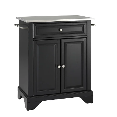Save valuable space with the Lafayette Compact Kitchen Island. Featuring a large cabinet with an adjustable shelf, this island can easily store pots, pans, or small appliances. The large drawer will keep small items like utensils and dishtowels close at hand, while the towel bars on either side can be used for added hanging storage. With a beautiful stainless steel countertop and sculpted feet, the Lafayette Compact Kitchen Island is a welcome addition to your kitchen space.