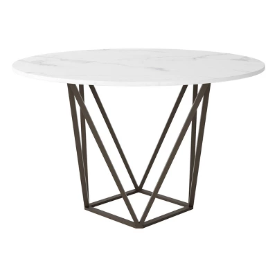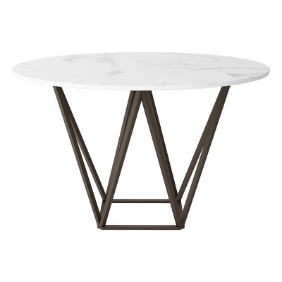 Perfect geometry. This gorgeous dining table with its smooth round marble-like top, rests on an architecturally inspired steel base for a look that is timeless. Its modern open air design is perfect for small spaces. The substantial surface with a slightly tapered base will seat four comfortably.