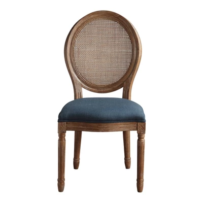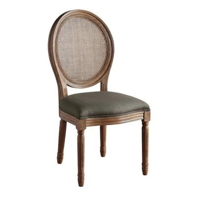 Embody French styled sophistication in your home with the Stella cane oval back chair. Beautifully fashioned, the natural authentic cane back and rustic finish enhance the look of any room. Graceful features like the scalloped front edge,fluted turned legs, and trim piping detail add classic appeal. Enjoy long dinner conversations in comfort on the liberally padded seat with durable sinuous spring support, wrapped in high performance, easy care fabric. This elegant chair is a perfect addition to your dining room, as an accent chair, or accompanying a writing desk.