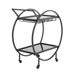 - •This indoor bar cart highlights circular frame and shelves as well as round caster wheels