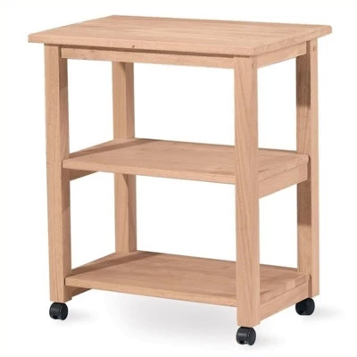 Simplicity is key with this quiet, functional wooden kitchen cart, crafted of sturdy South American Parawood. Industrial strength and traditional touches combine into a charming, traditional piece that will never go out of style. To compliment your own styles in the home, this piece is unfinished and completely customizable. Features: Made of solid parawood Casters provide easy mobility Some assembly requisite Ready-to-finish Specifications: Top piece: 26″ W x 17″ D Base piece: 23.38″ W x 14.88″ D Bottom to shelf: 12″ H Top to shelf: 10″ H Bottom to floor: 3.75″H Leg spread: 20.38″ W x 11.5″ D Need a few tips on that perfect finish? Click below for our custom stain and finish guide for Unfinished Collection. Do-It-Yourself Stain and Finishing Guide