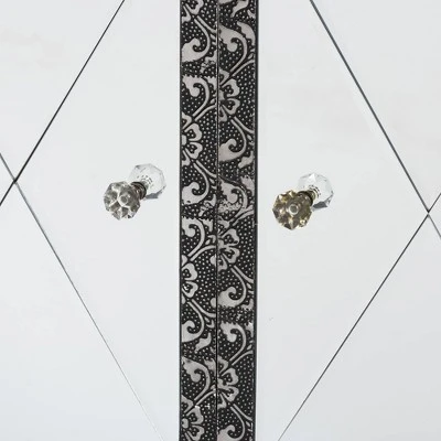 Introduce a bold statement of modern glamour to your space with the extraordinary Wycliff sideboard. Made in China, this stunning piece is comprised of a solid wood frame adorned with an embossed metal trim featuring a floral pattern. One drawer offers space to organize utensils, while the shelf behind the doors accommodates larger items. The Wycliff will arrive fully assembled and features mirrored glass panels that highlight the luxurious allure of the piece. Faux crystal drawer knobs lend a graceful touch, making the Wycliff sideboard a marvelous addition to any dining arrangement. Overall Dimensions: 29.90″ High x 24.00″ Wide x 11.80″ Deep; Drawer(Each): 20.50″ Wide x 9.40″ Deep x 5.10″ High; Storage Behind Door: 20.50″ Wide x 11.40″ Deep x 15.00″ High; Legs: 3.10″ High;